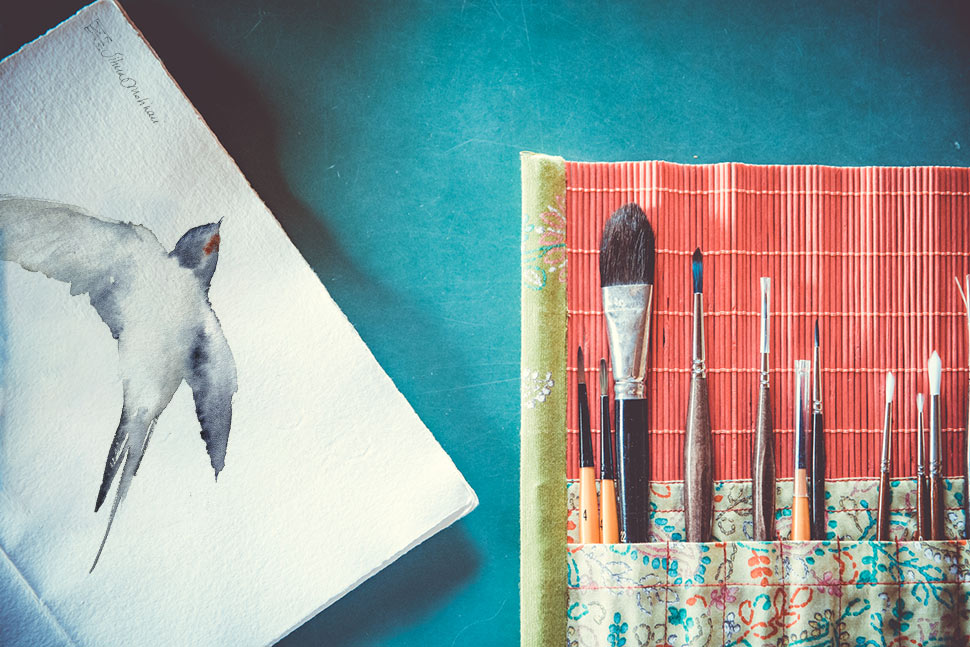 Colori brillanti, pastosi e luminosi, colori speciali con una componente di miele d’api per una resa vivida e trasparente che non deve lasciare residui. Sono questi gli strumenti che Silvia utilizza per realizzare i suoi particolarissimi acquerelli di natura, in cui i soggetti si stagliano su un bianco disarmante, sospesi. Carta di puro cotone, non sbiancata, non trattata con acido, non martellata. Carte create con cura artigianale, carte la cui trama antica è fatta per supportare l’acqua e non lasciarla scappare.